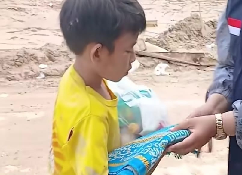 Foto ;Momen seorang anak di Aceh meminta bantuan sajadah kepada relawan. (Instagram/berkahyatimcom)